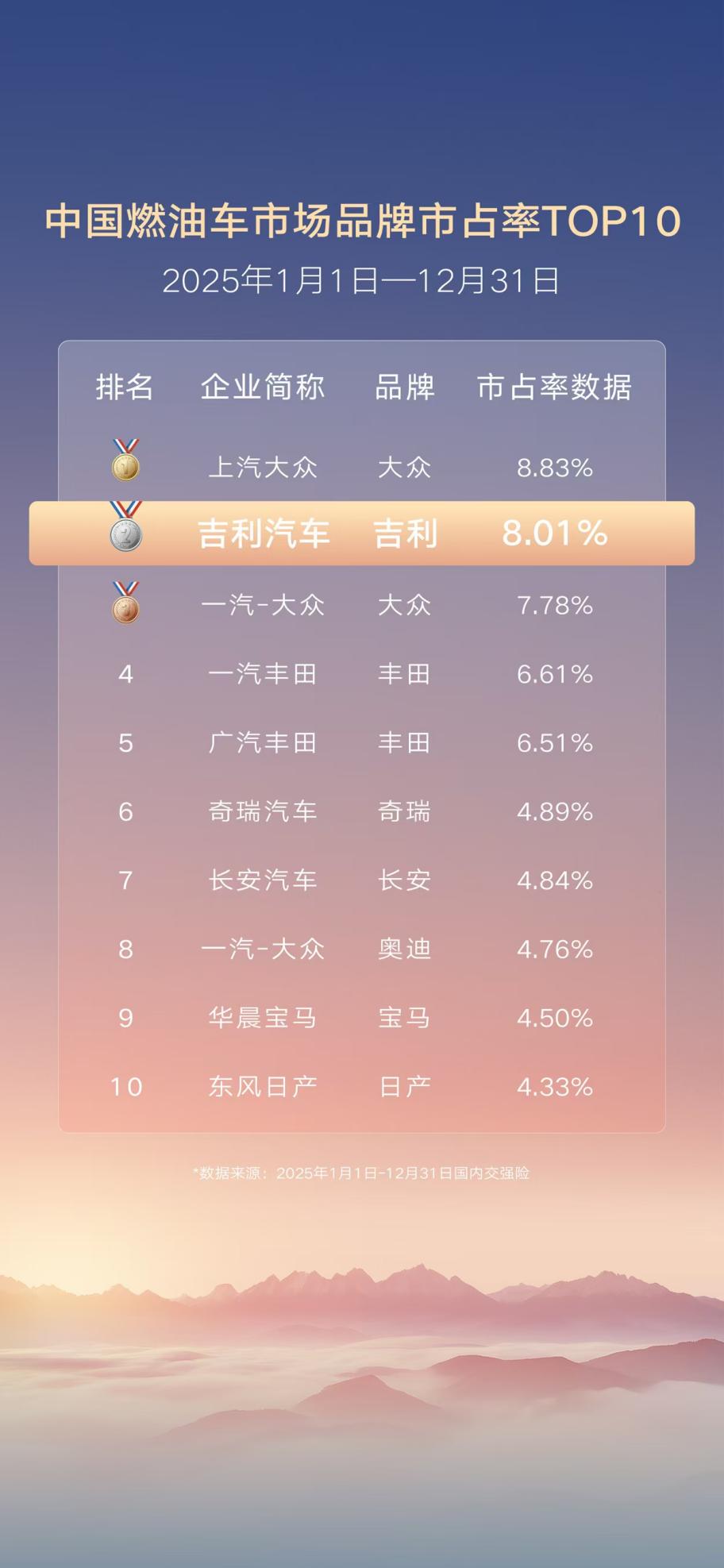 吉利中国星,连续9年蝉联中国品牌燃油乘用车销量冠军,2025 年卖了121.41 万辆,月均10万+。