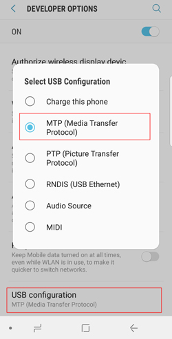 步骤 2. 从三星手机屏幕顶部向下滑动,将手机连接为媒体设备。为此,请将 USB 连接类型更改为“MTP(媒体传输协议)”或“PTP(图片传输协议)”。因此, Mac很快就会检测到连接的三星手机。