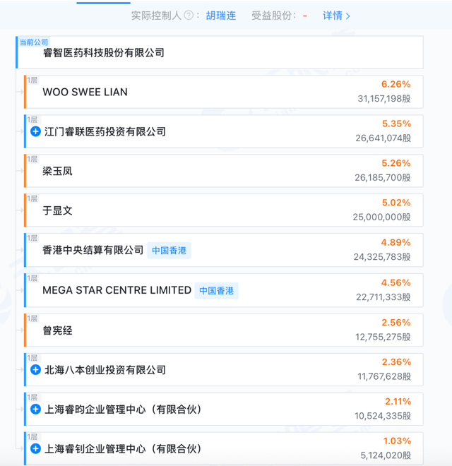 2025年5月,睿智医药公告披露,公司控股股东正式变更为胡瑞连。天眼查显示,截至2025年12月,胡瑞连仍为睿智医药实控人,直接持有 3115.7万股,占公司总股本6.26%。