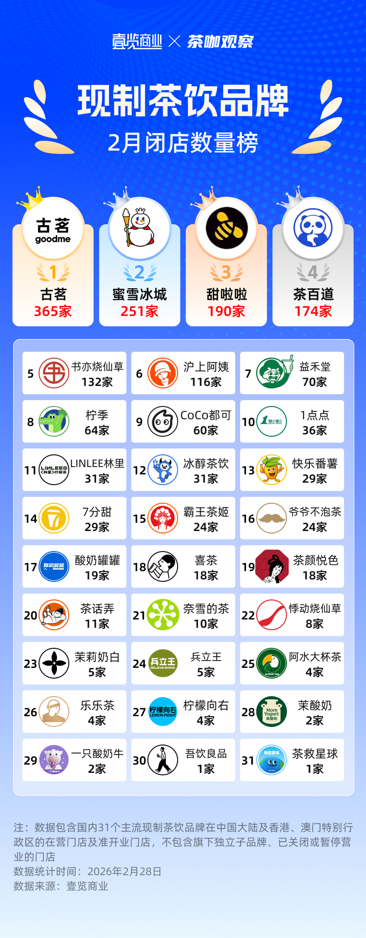 2026年2月,现制茶饮行业迎来春节后的快速复苏。壹览商业数据显示,31个主流品牌当月新增或恢复营业门店4683家,关闭或暂停营业1738家,净增2945家,门店总数13.78万家。