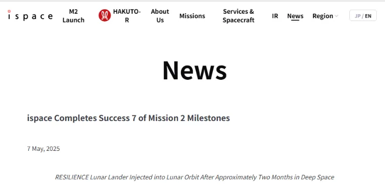 所以,2025年已经执行的两大登月任务,一次成功,一次失败,而日本的这一次“韧性”号(Resilience)也出现了新消息。