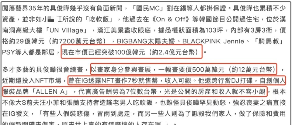 据悉,具俊晔在遗产分配中分得了大S三分之一的财产,约数亿台币。