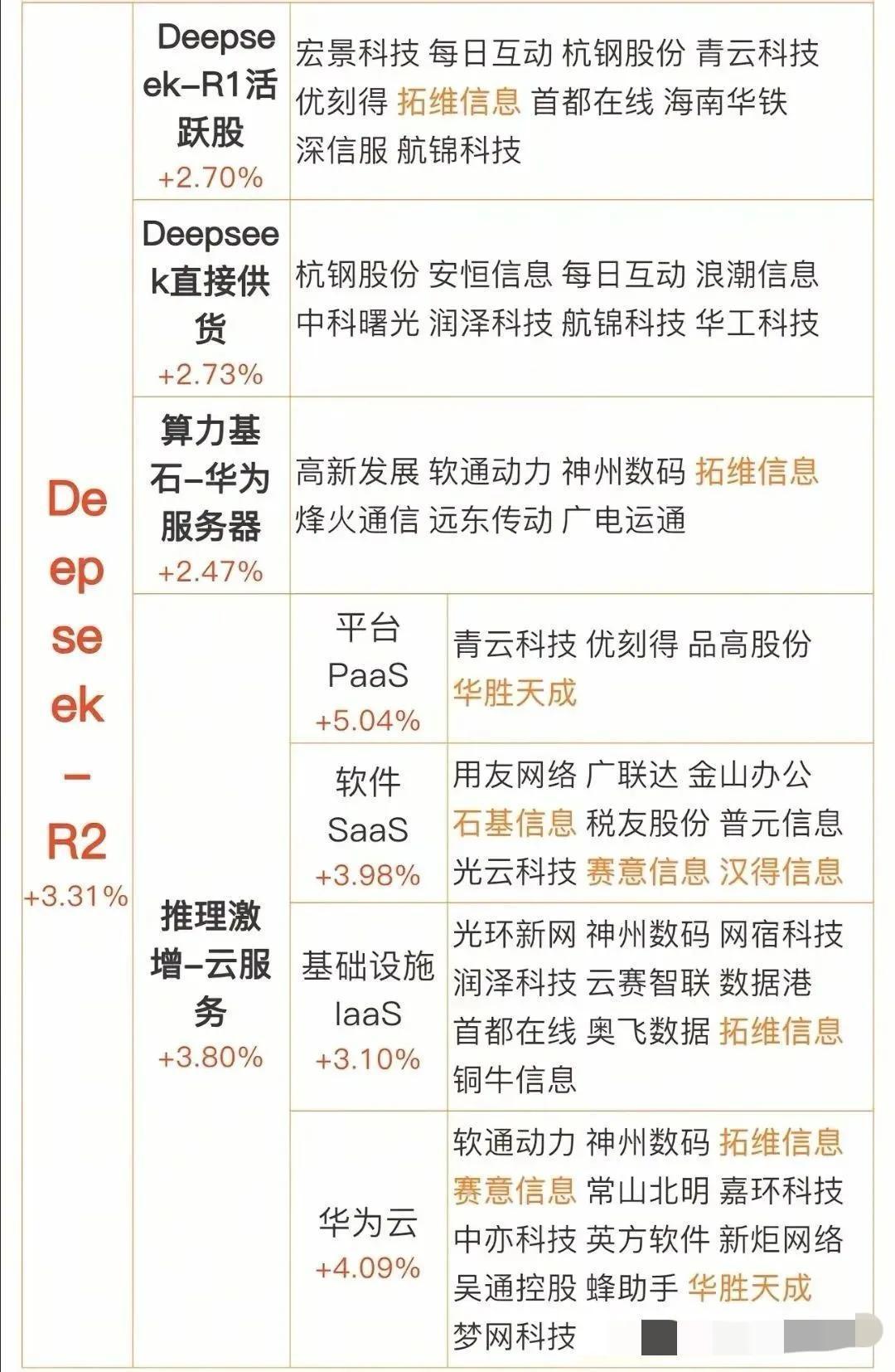 四、DeepSeek引领大模型基建潮大模型应用爆发拉动底层算力需求!DeepSeek相关合作企业表现活跃,其技术落地推动云服务产业链全面受益: