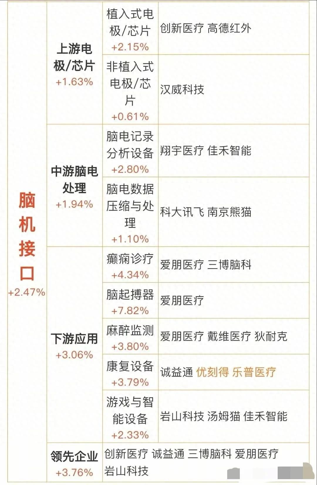 一、脑机接口:医疗应用站上风口脑机接口产业链正加速成熟。上游植入式电极/芯片环节,创新医疗、高德红外等技术领先;中游脑电处理设备由中国脑电科技等主导,数据处理能力突破显著;下游应用端爆发力最强——癫痫精准诊疗、脑起搏器等医疗场景增长迅猛(部分细分增速超7%),康复设备、麻醉监测紧随其后。游戏与智能设备领域,深圳科技、汤姆猫等积极探索脑电交互新体验。