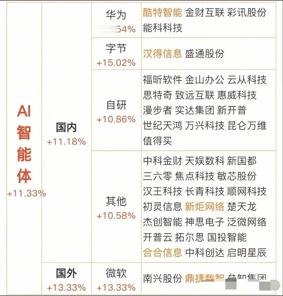 三、AI智能体:巨头生态圈竞争白热化AI智能体市场迎来“群雄割据”!国内巨头表现抢眼:华为生态圈带动酷特智能、彩讯股份等伙伴;字节阵营中汉得信息、盛通股份深度协同。企业“自研派”阵营庞大,金山办公、万兴科技、昆仑万维等覆盖办公、创意工具;微软生态亦有南兴股份、鼎捷数智等国内合作方。技术落地呈现多元化,涵盖金融、游戏、安全等场景。