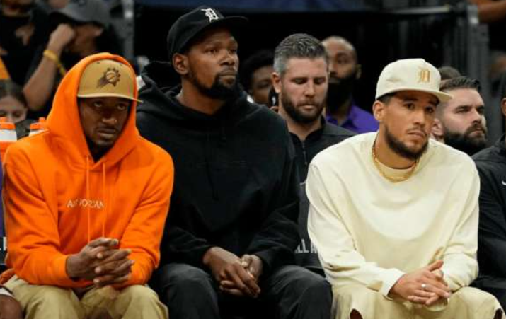 太阳三巨头在场边的一幕引热议,有美球迷调侃杜兰特和布克正在沟通如何让球队送走比尔,还有美球迷发问:比尔已经打完了太阳生涯最后一场比赛了吗?