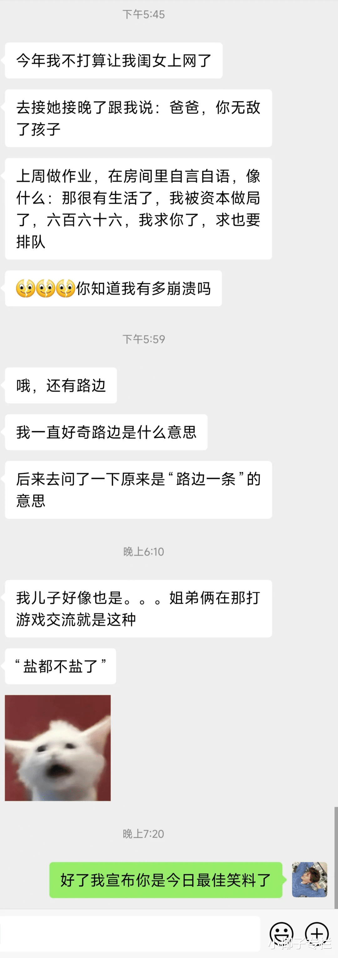 比如有父亲跟自己同事吐槽自家女儿,去接她接晚了她说:“爸爸,你无敌了孩子。”