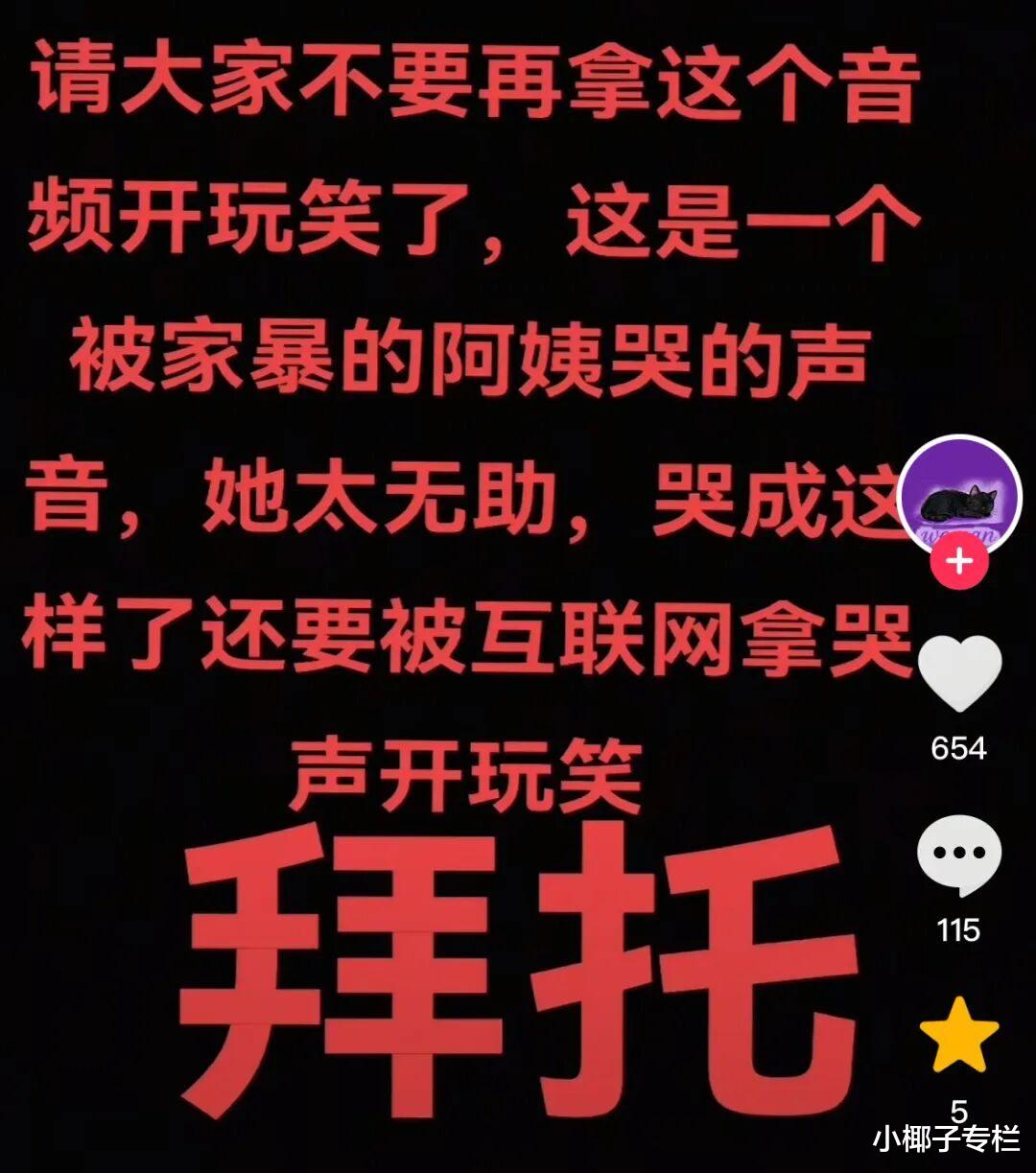 比如,很多人都在用一个阿姨哭得上气不接下气的声音,给自己的视频当背景音、玩梗。
