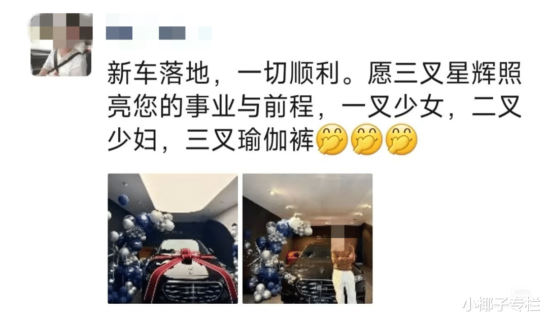“新车落地,一切顺利。愿三叉星辉照亮您的事业与前程,一叉少女,二叉少妇,三叉瑜伽裤。”