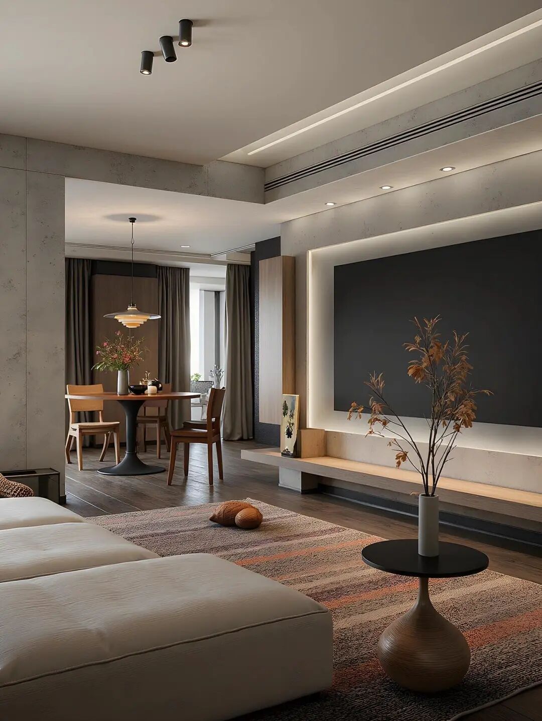 线性灯藏进吊顶、复古吊灯悬于角落,自然光透过纱帘漫进来,白天柔和、夜晚温馨,氛围感拉满!