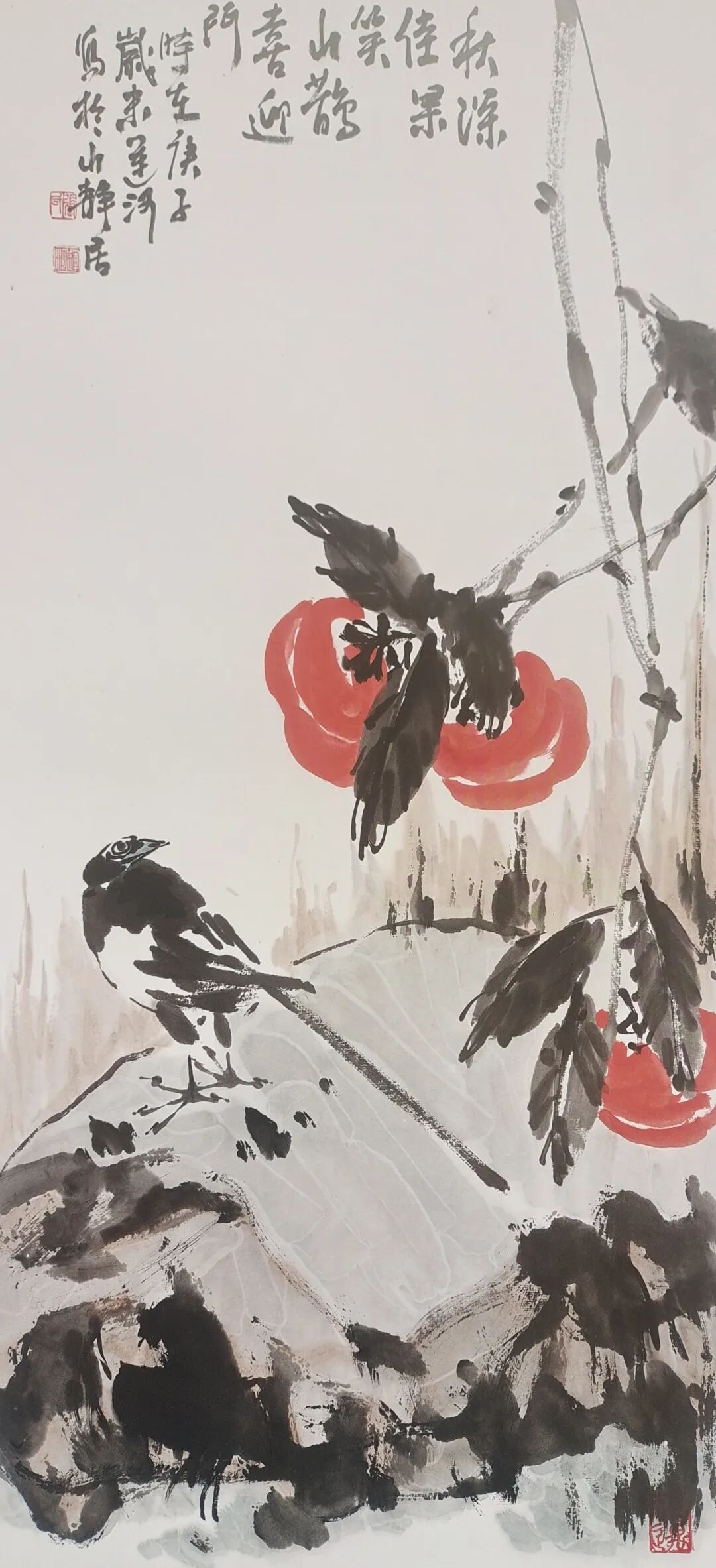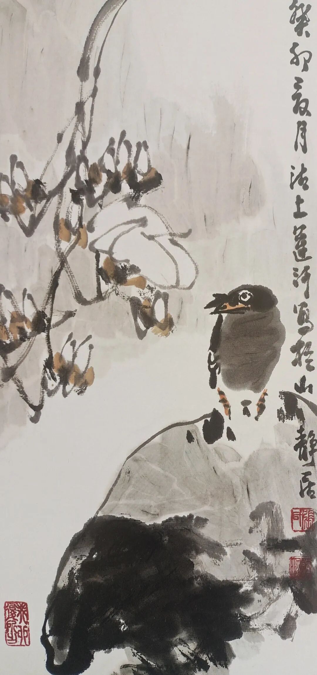 其花鸟画的意趣,还在于简约笔墨中藏着的生命张力。他不刻意描摹花鸟的外在形态,而是捕捉其瞬间的动态与神韵,或枝间禽鸟的轻跃,或草木绽放的舒展,寥寥数笔便定格自然生灵的鲜活,画面简约却意趣盎然,观之如见自然本貌,让观者从笔墨间感受到自然生机,体会写意花鸟“以少胜多、笔简意丰”的艺术魅力。