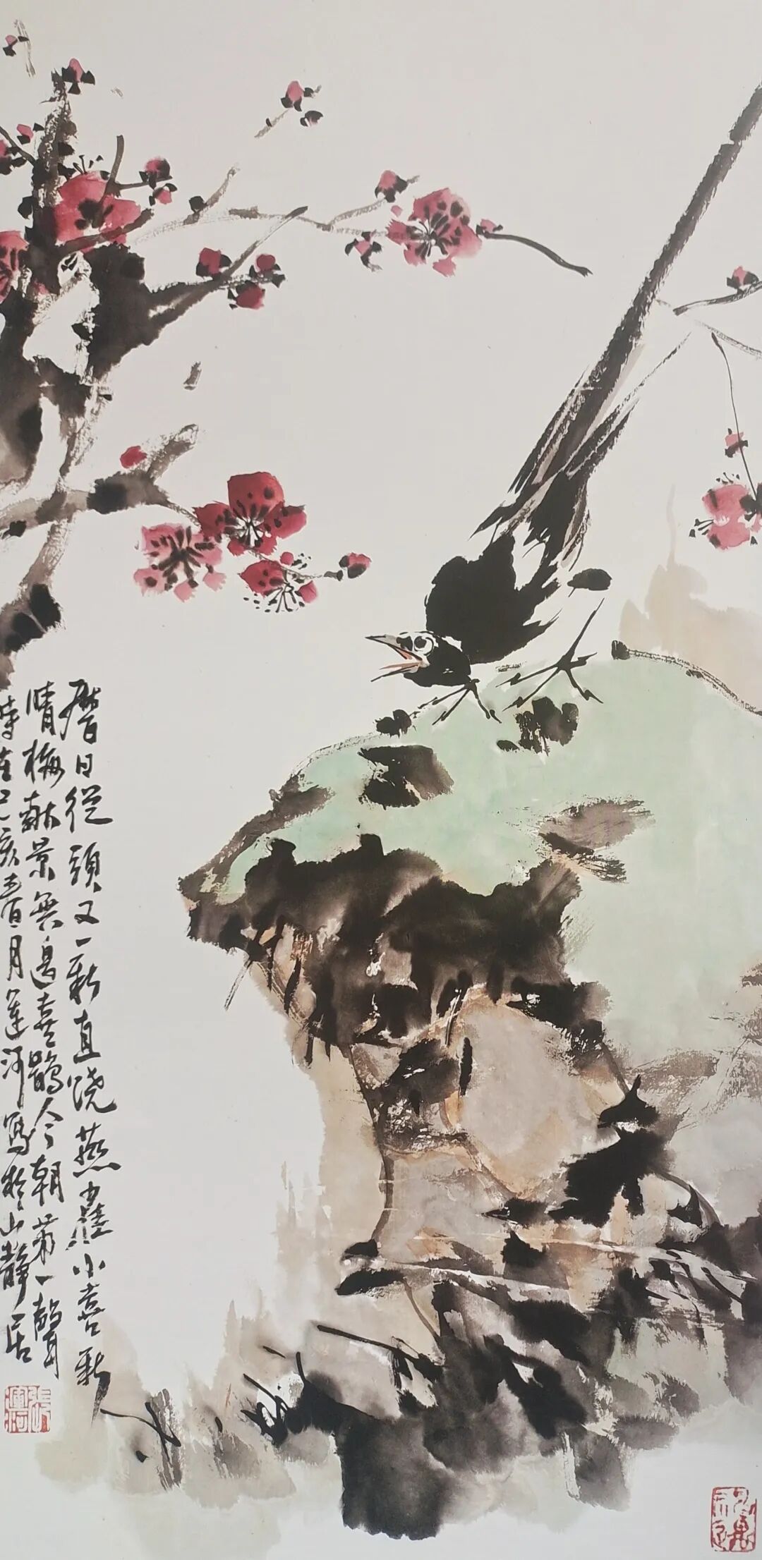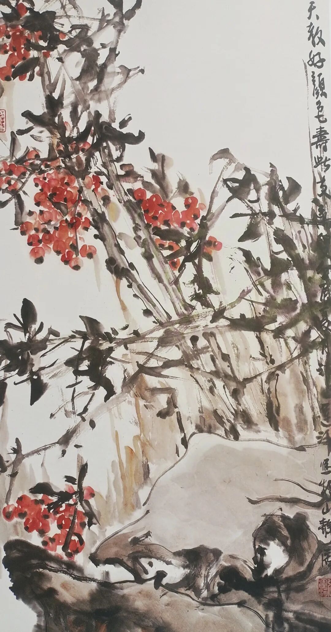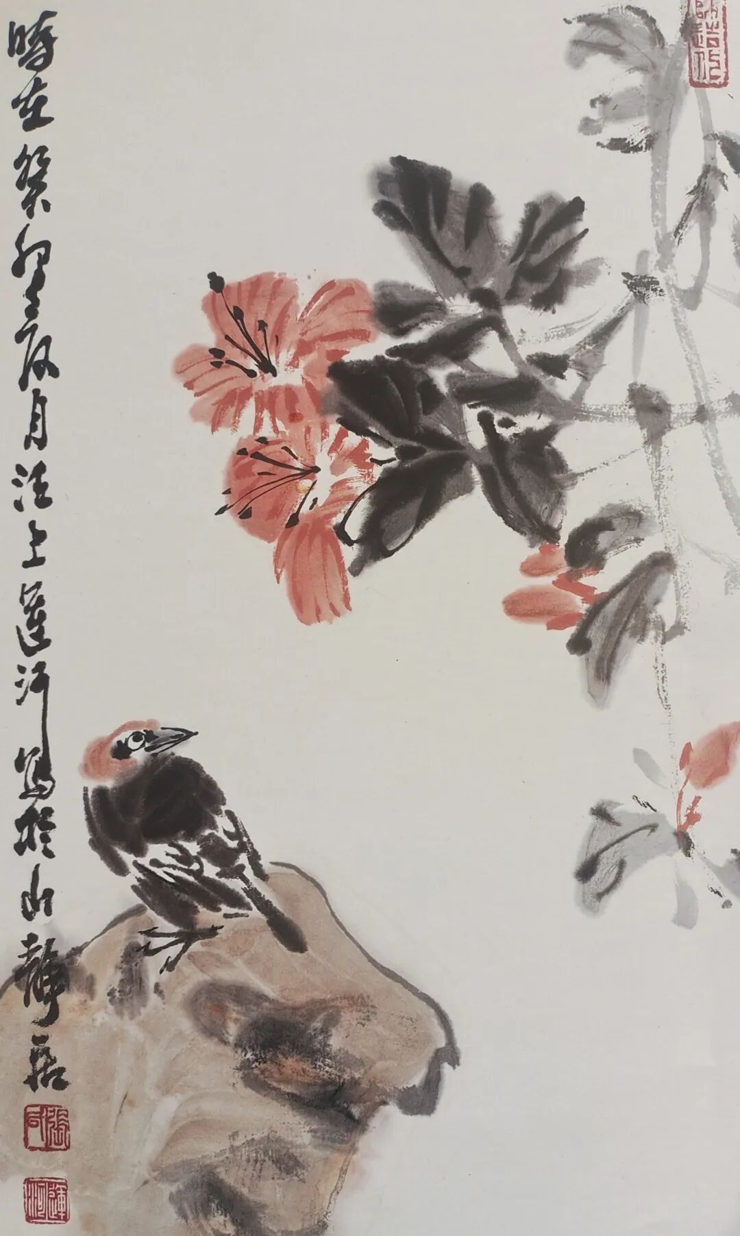 作为山水大家,其花鸟画最鲜明的特色,便是山水笔墨与花鸟创作的深度交融,实现了技法与视野的双向赋能。用笔上,他将山水画的骨法用笔融入花鸟,线条老辣苍劲、顿挫有力,画老干用逆锋皴擦见苍润,绘藤蔓以中锋侧锋交替如草书挥写,刚柔相济间,每一笔都有筋骨、有气韵,尽显笔墨功底;用墨上,借鉴山水画积墨、破墨之法,浓淡干湿并施,墨色层次丰富却通透不滞,花卉多以墨骨定形,再施淡彩,色不碍墨、墨色相融,禽鸟则以墨色对比凸显神态,墨韵与形神兼备。