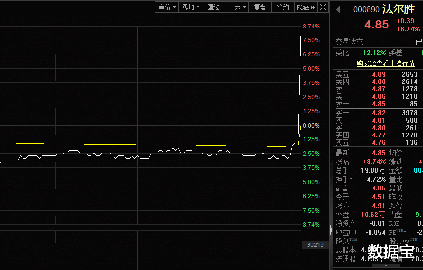 12月10日尾盘集合竞价阶段,法尔胜(000890)出现一笔超级大单,3分钟内成交3.85万手,约合金额1865.4万元,单笔成交量占全天成交的比例接近20%。在大单作用下,法尔胜股价在集合竞价阶段由绿盘翻红,收盘涨幅达到8.74%,拉升幅度超过10%。
