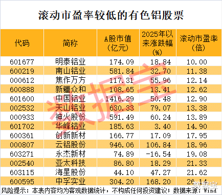 明泰铝业滚动市盈率为10倍,排在最低位置。公司是铝加工行业产品多元化和再生铝保级应用双龙头企业,铝板带箔业务方面现有产能160余万吨。2025年,公司重点推进新能源电池材料、汽车轻量化用铝、机器人铝材,从铝塑膜铝箔到液冷板,公司打造了完整的电池材料产品生态系统。