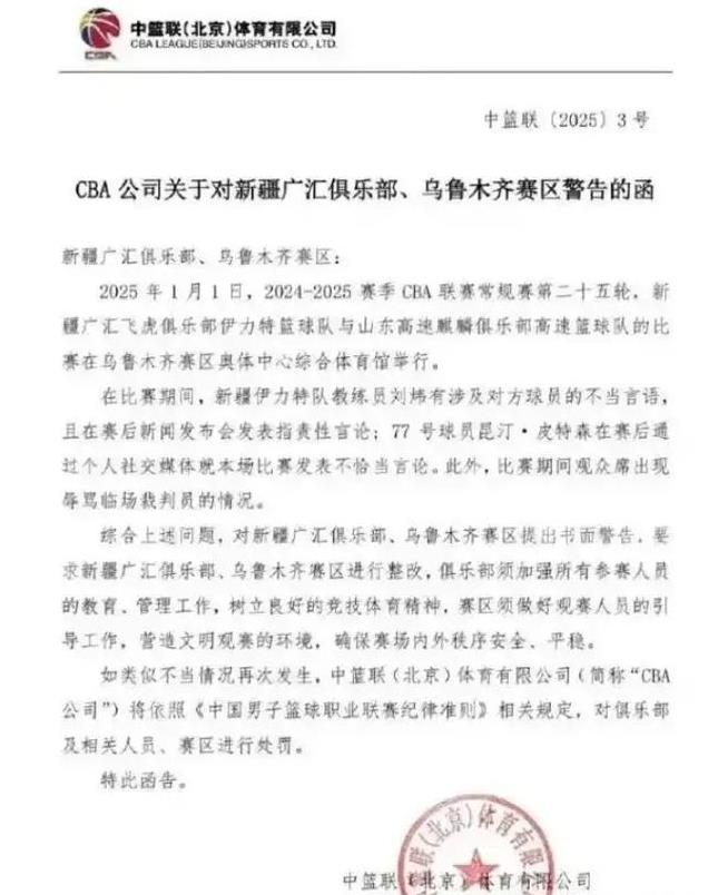 第二个消息:CBA联赛再次开出一张警告函。原来新疆男篮在之前对阵山东的比赛结束后,新疆男篮外援皮特森在社交媒体炮轰联赛能在一块场地同时进行篮球和橄榄球运动,而且比赛期间还有观众席出现了辱骂裁判员的情况,另外刘炜主教练也在比赛中对山东球员发布不当言语,而且赛后发布会的采访也有指责性的言论。