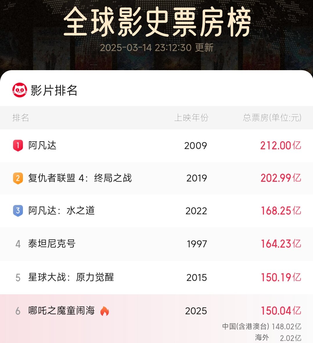 截至2025年3月14日,《哪吒之魔童闹海》(以下简称《哪吒2》)全球票房突破150.01亿元(约21.8亿美元),其中国内贡献147.98亿元,海外市场首轮上映斩获2.02亿元。仅用45天,该片便超越《狮子王》《冰雪奇缘2》等好莱坞经典,登顶全球动画电影票房冠军,并即将超越《星球大战:原力觉醒》(150.19亿元),跻身影史票房总榜第五名。