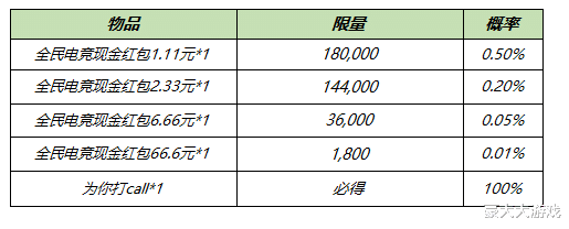 电竞喝彩福袋打开后玩家有一定的概率获得随机的现金红包,金额最高可达66.6元。只要你是欧皇,一个免费皮肤钱就到手了,只是66.6元的概率有点低,只有0.01%。