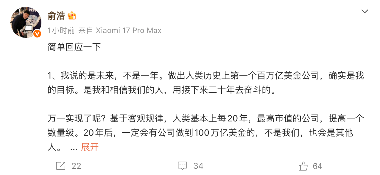 2026年1月17日,追觅CEO俞浩在社交媒体平台发布长文,回应近期一系列争议言论,明确表示,“没有自我膨胀,百万亿美金公司是长期目标。”