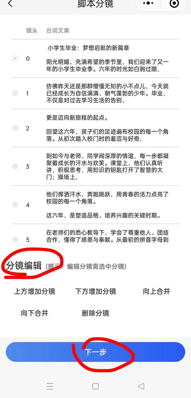 这里还可以进行分镜编辑,你可以自由选择分镜内容,再点击“下一步”。(如上图所示)