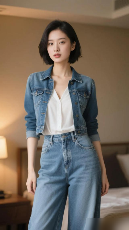 参考资料2里提到,全身牛仔要“深浅分明”,外套选浅蓝,裤子选深蓝,内搭亮色吊带露腰,视觉上主次分明;参考资料9里说,选牛仔短裤要“看腿型”,腿细选修身款,腿粗选不规则磨边款;还有配饰——一条金属腰带能让全身牛仔更利落,一双短靴能拉长腿部比例,一个斜挎小包能平衡休闲感。