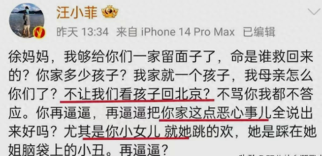 对于这份看似是大S低头的声明,汪小菲并不买账,他手撕大S遮羞布,公开怒怼大S以及她妈妈,称凭什么不让自己的孩子回北京,说是共同抚养,为什么每次都要阻挠孩子与奶奶团聚,就连去台北看孩子也要阻挠。