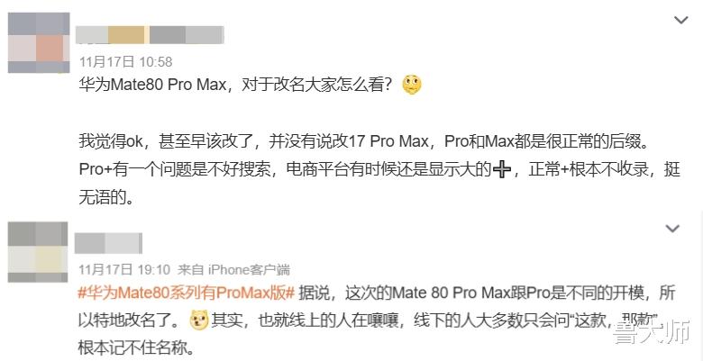对于机型改名,网上评价从来都是严重的两极分化,例如之前的小米17改名,而此次Mate80 Pro Max也不意外。