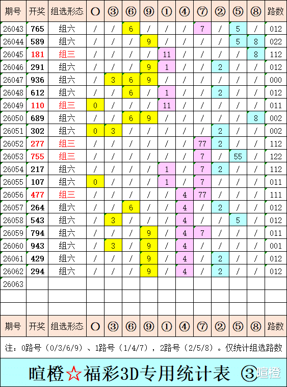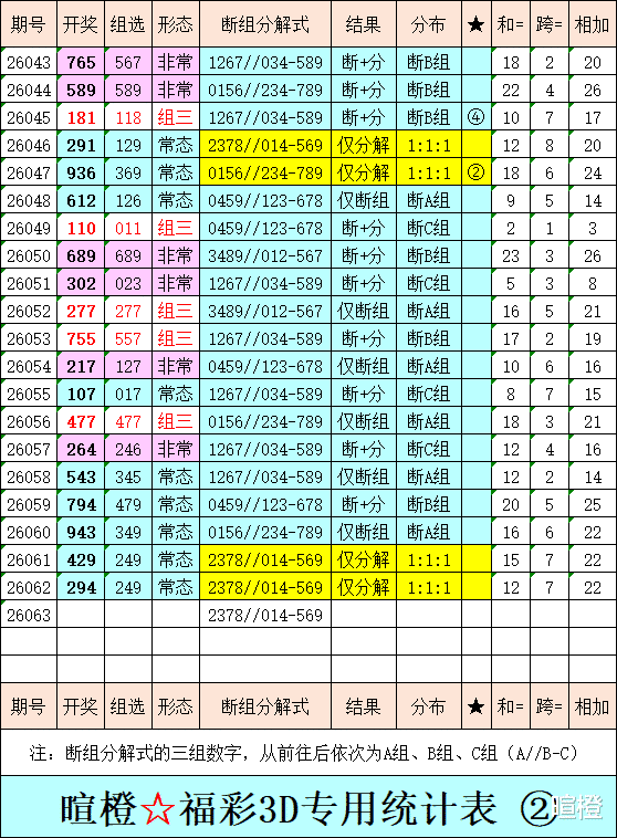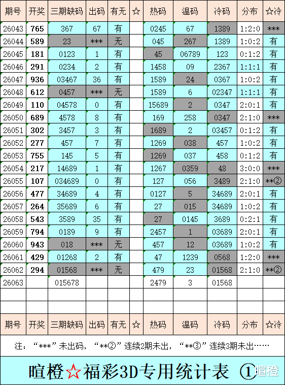 26063期:暄橙福彩3D综合条件(本期将在3月14日21:15开)一、上期回顾 ☆1、上期开奖号:2 9 4。2、和值= 15,跨度= 7。3、常态组六,012路组合。4、热度分布(热:温:冷)2:1:0。二、本期条件 ☆1、三期缺码:015678。2、热:2479,温:3,冷:01568。3、断组分解式:2378//014-569。4、四胆:2567;三胆:267。三、术语解释 ☆1、三期缺码:0至9这十个自然数当中,未在近三期开奖号出现的数字。2、热度(热温冷):自然数0至9,在近七期开奖号中,出现3次及3次以上的数字,称为热码;出现2次的数字,称为温码;出现1次和未出现的数字,称为冷码。某个数字在开奖号中出现几个,就按几次计算。3、断组分解式:将0至9这十个自然数,分成三组数字,从前往后依次为A组(4码)、B组(3码)、C组(3码),一般情况下,有一组数字不出码,偶尔会有两组数字不出码。A组不出码的情况相对较少。断组为主,分解为辅。4、常态组六号码:同时包含大数、小数、奇数、偶数、质数、合数的组六号码,共有72注。统计表中,简称“常态”。5、非常态组六号码:全大数、全小数、全奇数、全偶数、全质数、全合数等六种形态的组六号码,共有48注。统计表中,简称“非常”。★提醒:彩市有风险,参与须谨慎!水平有限,仅供参考!