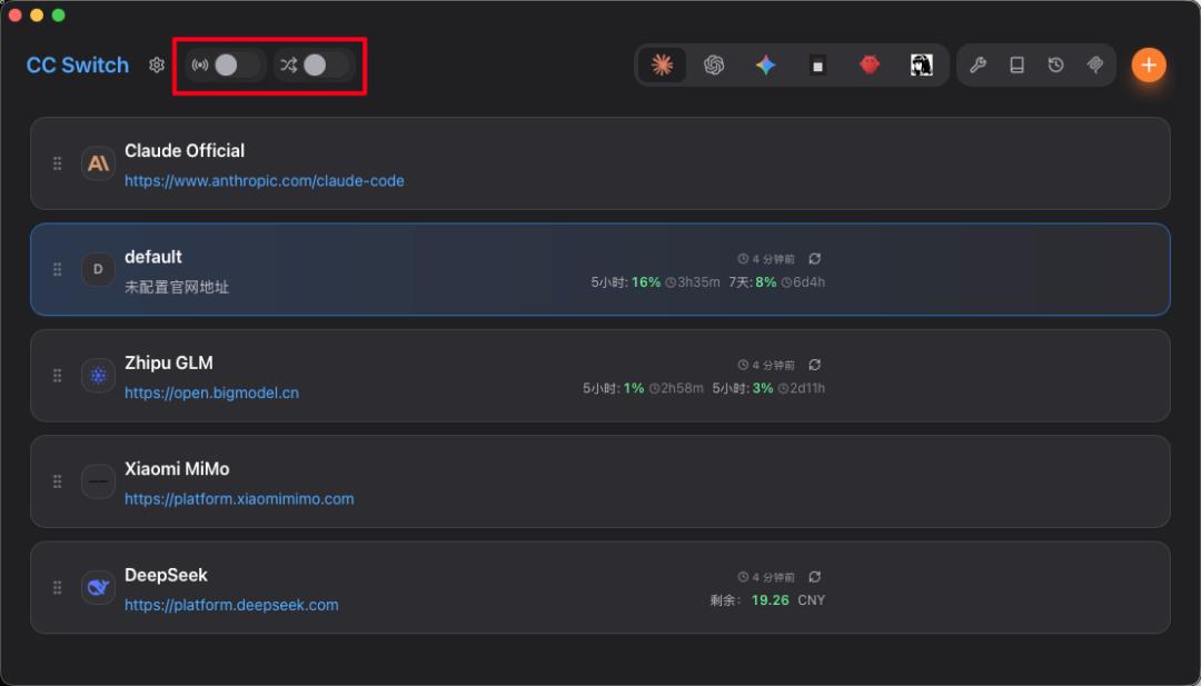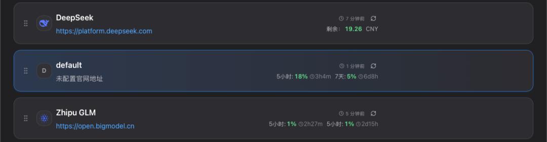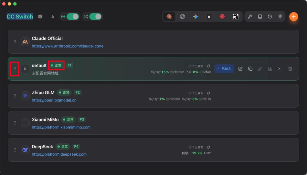 这样CC Switch会优先列表上面的供应商进行路由,碰到故障就自动往下一家切。每个供应商卡片上会显示一个健康状态徽章。