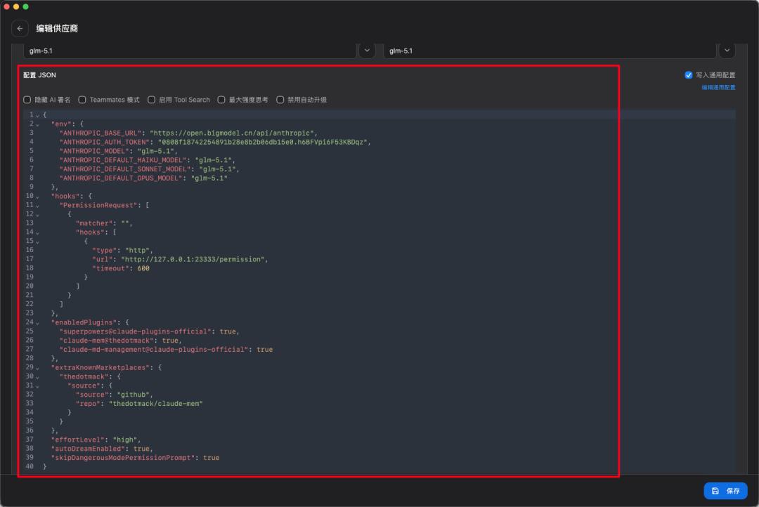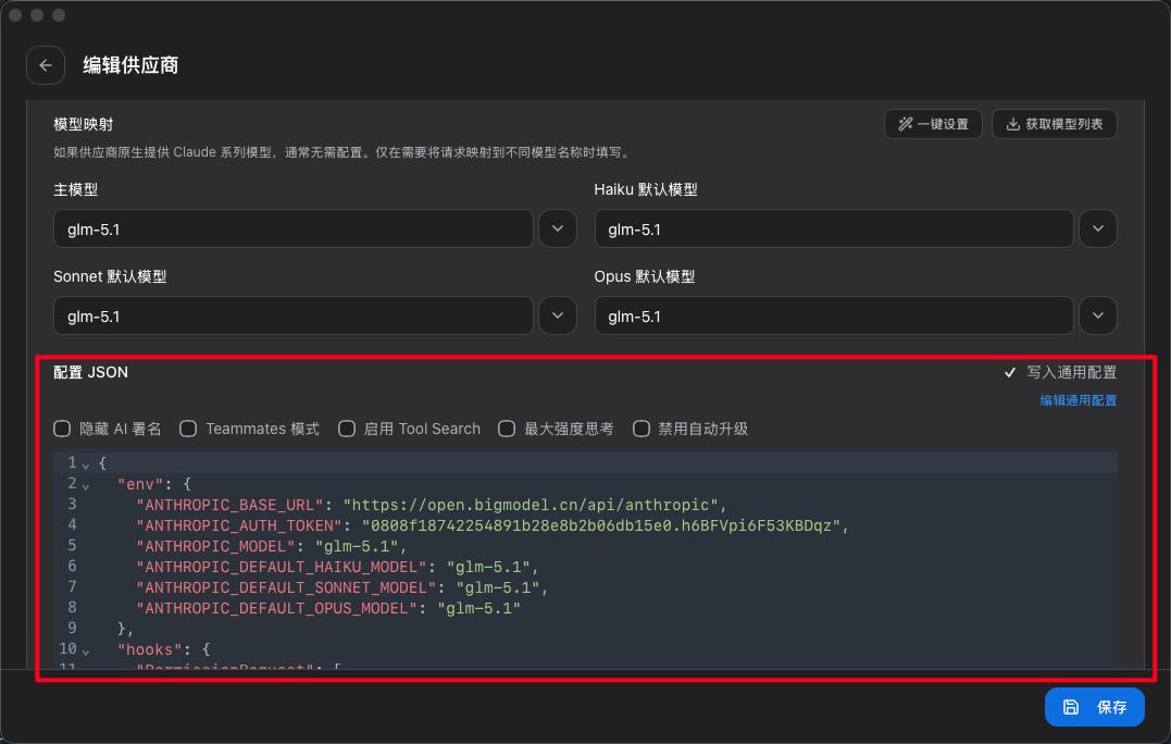 这里的配置json文件,就是CC Switch会写进Claude code的settings.json里面的内容,但其实我们根本不用管。