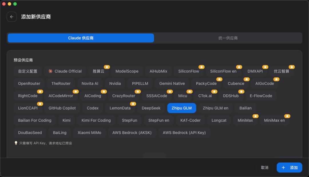 它内置了40+家供应商的预设,智谱、MiMo、DeepSeek、千问、Kimi、MiniMax、DouBaoSeed、阶跃等等等等,反正国内主流的他基本都有。