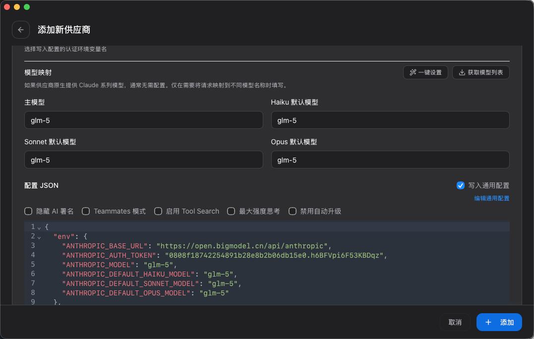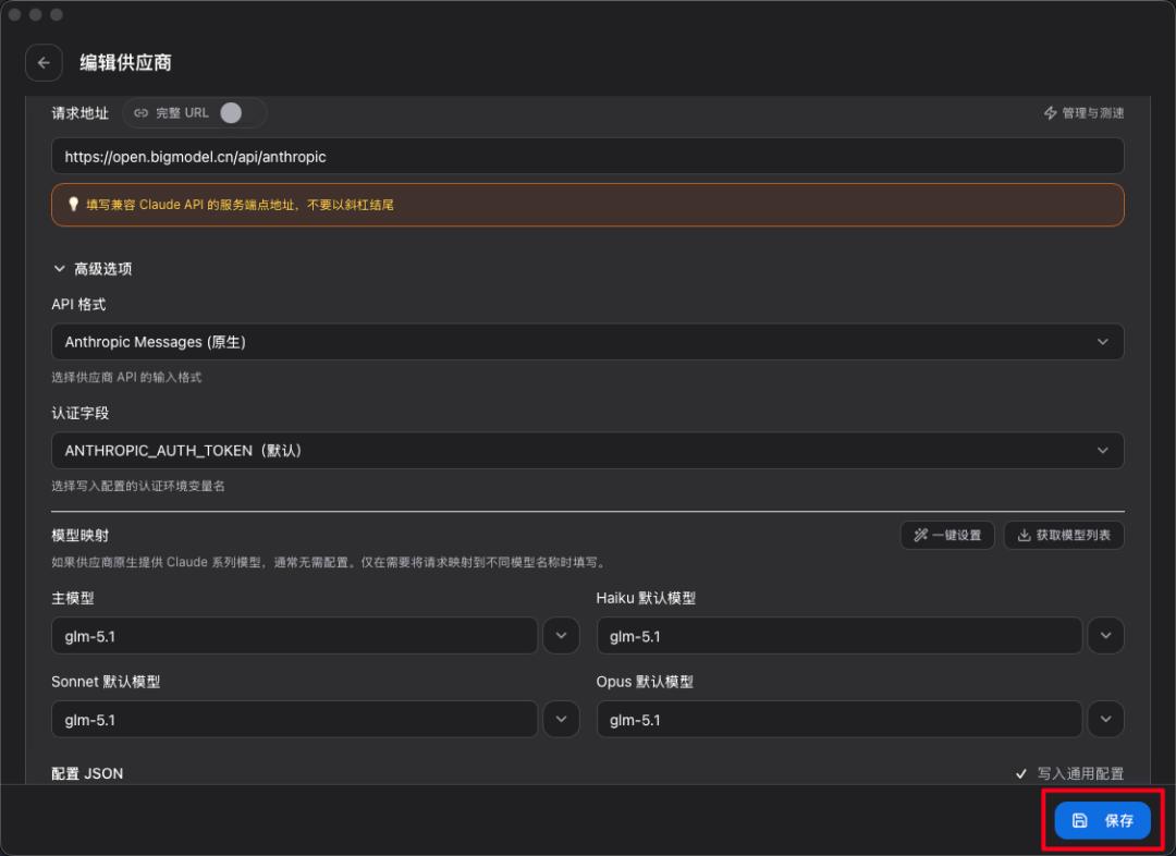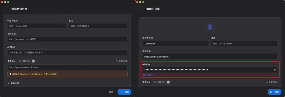 选好供应商之后,除了API Key,剩下的字段它都帮你预填好了,完全不用你操心。