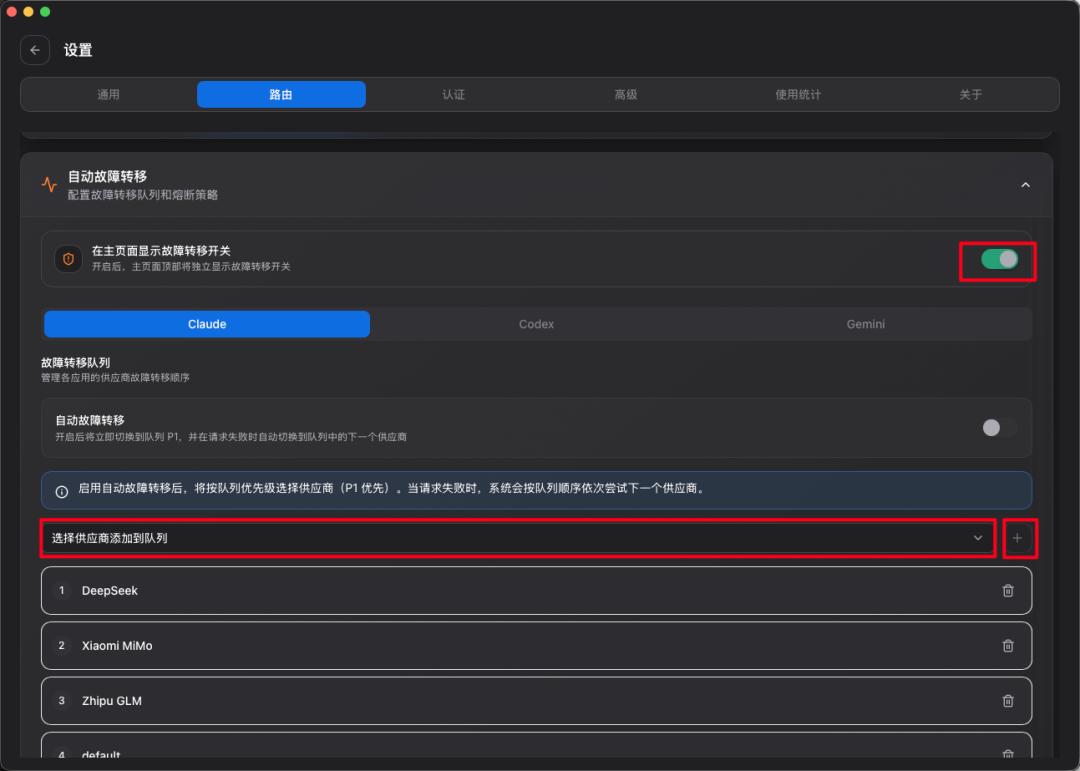 然后我们打开自动故障转移,选择Claude,再点添加供应商,把你要做备用的几家加进队列。
