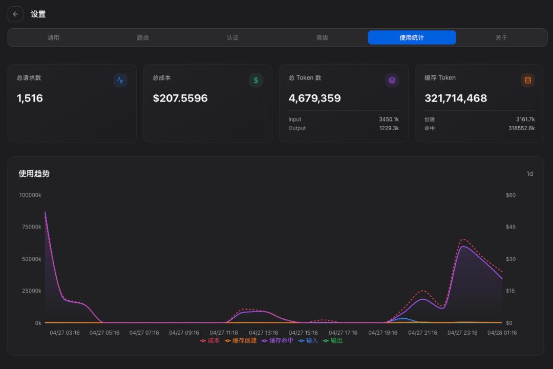 除了用量,CC Switch还提供了更详细的使用统计,可以更直观地看到每个时间段的成本消耗。