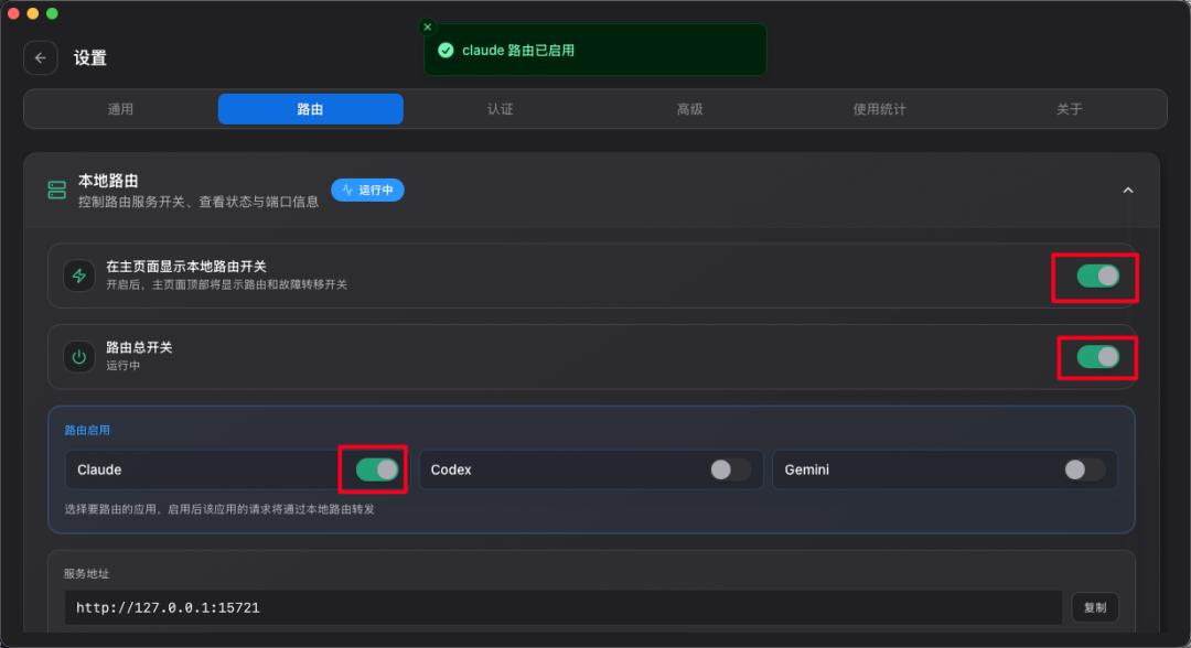 然后在应用路由区域启用Claude路由,把Claude Code的请求接到本地代理上。
