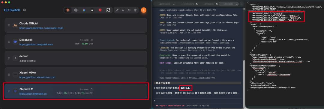 这玩意装上以后有一个很爽的点就是,在Claude Code里面,热切换模型的操作变得无敌简单。