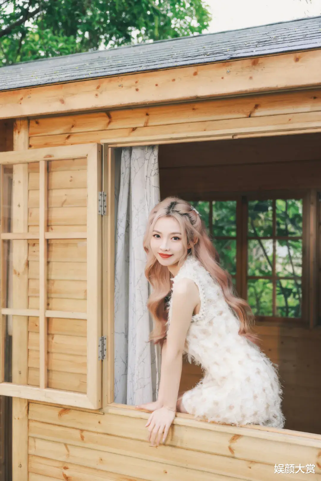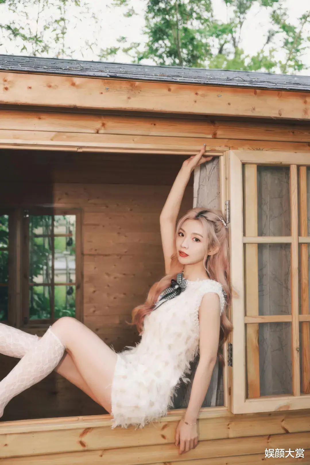 可以看到许杨玉琢坐在木屋的窗边,穿了条白色羽毛短裙,这种清爽打扮特别抓人眼球。领口蝴蝶结的设计,简单又可爱,让整条裙子看起来更有层次感。仔细看的话,裙子的做工很讲究,在太阳底下还能看到布料微微反光。