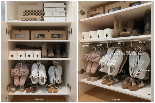 1)抽拉鞋架:给鞋柜安装上伸缩杆做纵向收纳,35cm的深度可以放4双,方便收纳备用拖鞋和换季的鞋子。