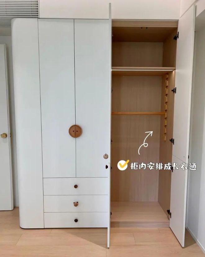 2)孩子衣柜:儿童衣柜挂衣区一定要安装上“成长衣通”,方便调整挂衣杆的高度,满足孩子不同年龄段的挂衣需求。