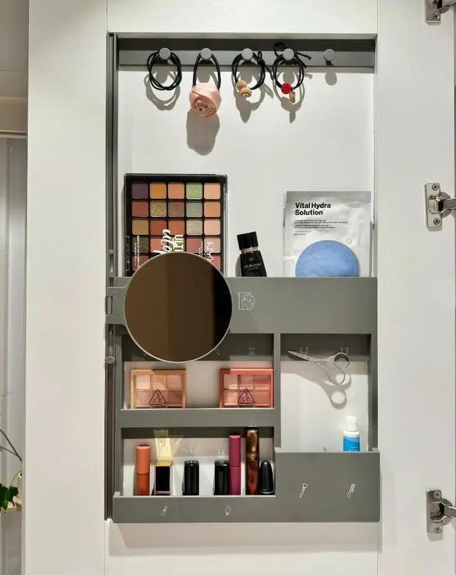 2)柜门区:柜门可以不用整块板,直接用门框就好,这样镜子背面也可以做一些零碎收纳。
