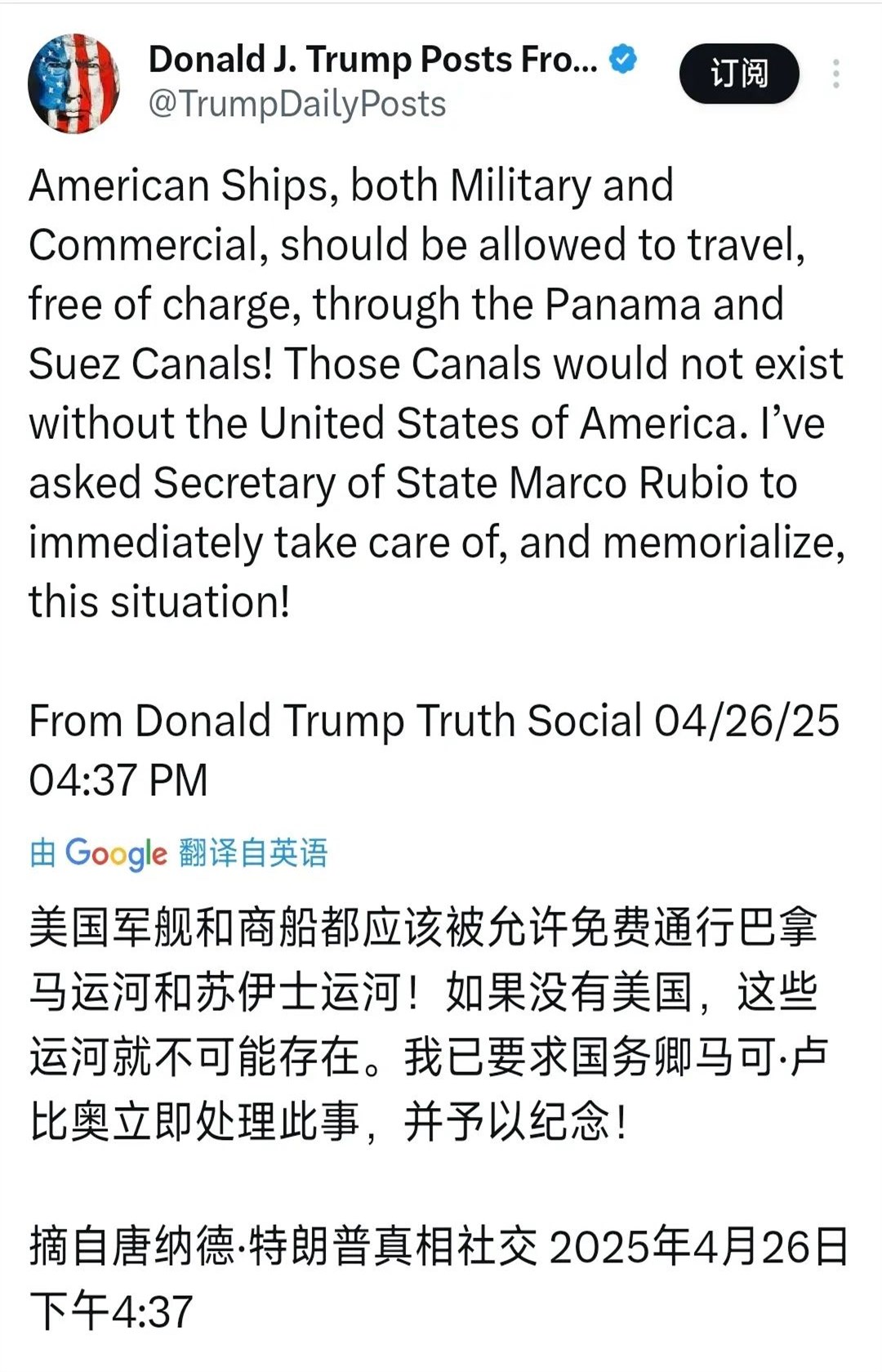 (特朗普称,美国军舰和商船应免费通行苏伊士运河)