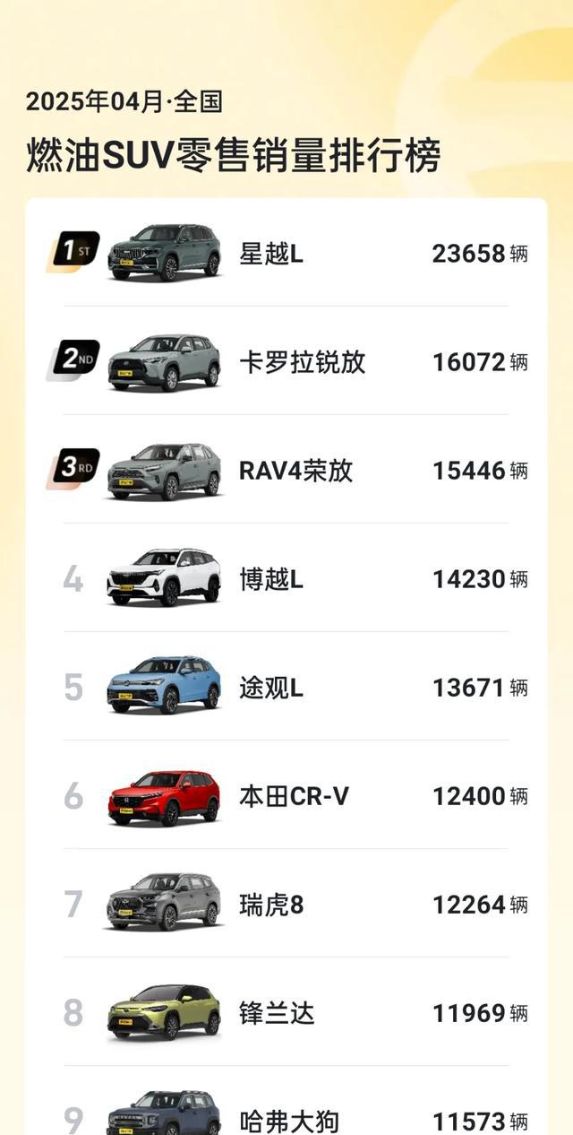 在当今的汽车市场中,燃油SUV的竞争愈发激烈,各大品牌为了获得消费者的青睐,纷纷推出各种新车型。数据一出,销量排行榜却透露了不一样的真相。2025年4月的燃油SUV销量排行榜如同一场无声的搏斗,14款车型销量下滑的事实令业内人士开始反思:燃油车市场究竟发生了什么?星越L以23658辆的销量夺得冠军,似乎在告诉大家,它的成功并不是偶然,而其他车企是否也能跟上这个步伐,值得我们深思。