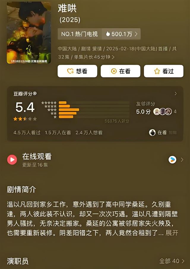 《难哄》单日播放量破亿,豆瓣评分5.5,社交媒体争议话题榜首,女主章若楠红利明显。