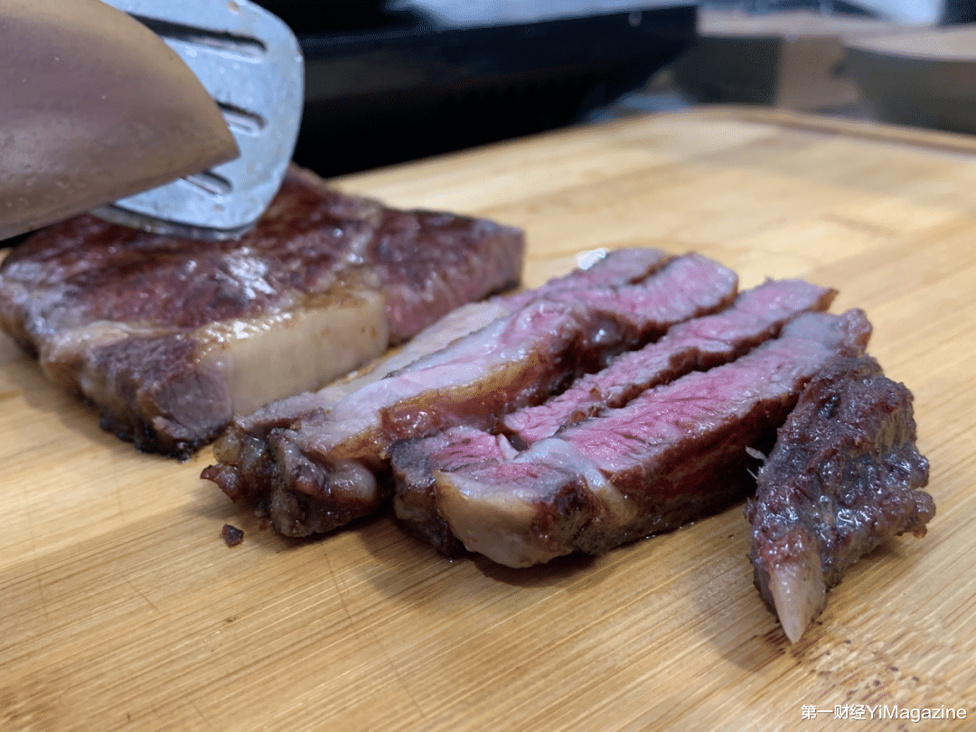 张强煎制的盒马熟成牛排,他喜欢7分熟