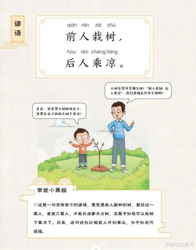 比如“前人栽树,后人乘凉”这句话,光读孩子很难理解。但在这本书中,常爸就通过与儿子的对话来切入。