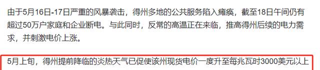 尤其是美国的得州,在2024年5月17日的时候,提前降临的炎热天气已促使该州现货电价一度升至每兆瓦时3000美元以上,电价暴增近百倍,1度电,折合人民币21.7元。