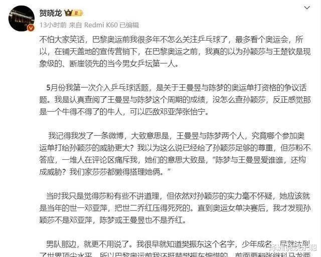 回过头来看贺小龙的道歉,他在文中提到自己经历了“痛苦、压抑、悲伤”,甚至抽了一整条烟来缓解压力。这种描述虽然略显戏剧化,但也说明了网暴带来的巨大心理负担。他承诺未来将“忠于刘国梁,热爱莎头”,试图用实际行动修复与粉丝的关系。这样的转变值得肯定,但更重要的是,他能否真正改变自己的表达方式,避免再次触碰敏感点。