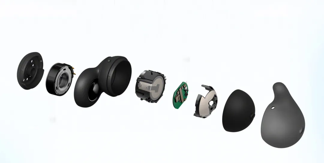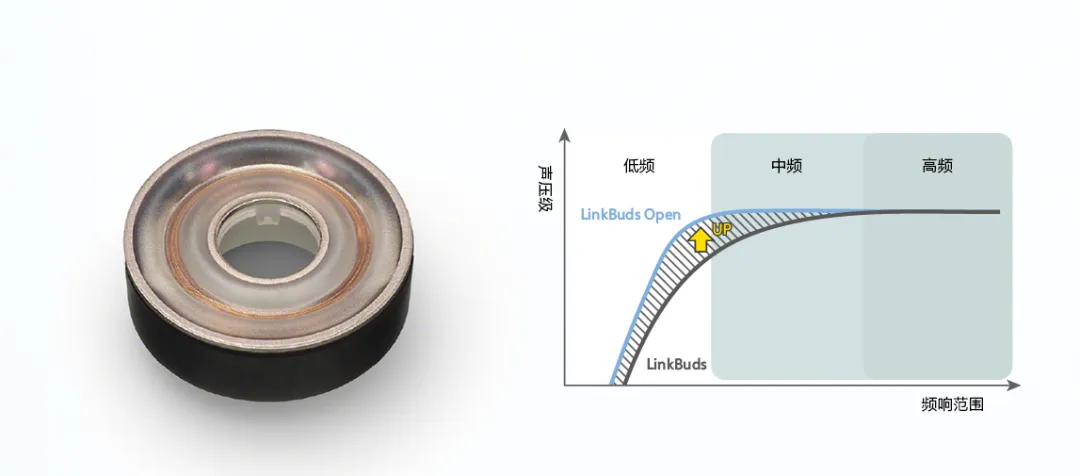 除了音频处理芯片,LinkBuds Open事实上还升级了发声单元,前一代的环形发声单元其实就已经充满想象力,新一代的 11mm环形驱动单元(相对前代12mm单元,体积是有所减小的)更是采用了更优秀的高顺应性振膜,和高性能钕磁铁,从而使中高频音色更为清亮,声场更加宽广;不仅如此,新发声单元还通过振膜形状和磁环的优化,进一步扩展了低频还原效果与声压场,让低频不仅要低得下去,还要拥有细腻的细节还原。