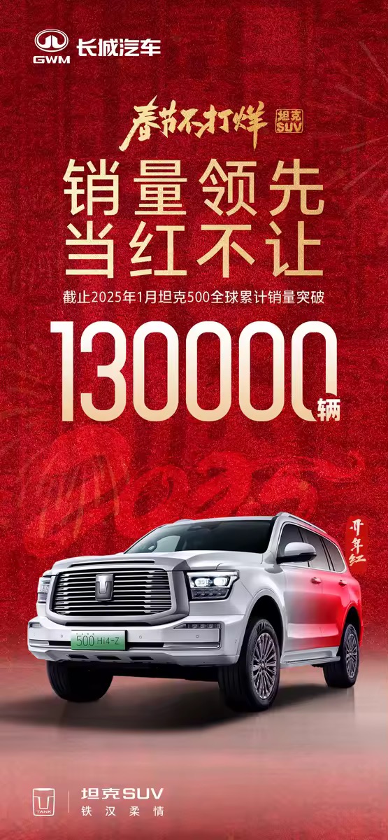 泛越野超级电混架构Hi4-Z凭借“超长续航、超强性能、超高能效”三大核心优势,突破了传统动力布局的限制,并能够提供2.0T和3.0T两套动力总成布局,实现泛越野分级下的坦克最优解。今年1月1日首款搭载Hi4-Z架构的车型坦克500 Hi4-Z正式上市,凭借出色的市场表现销量稳步攀升,为Hi4-Z架构的卓越技术实力提供了有力佐证。坦克500全球累计总销量已达13万辆,25年1月坦克500全系首周销量更是突破2056辆,荣登30-40万级新能源越野SUV月销量第一,充分展现了市场对其硬核实力的高度认可,进一步巩固了坦克品牌在新能源越野细分市场的领先地位。