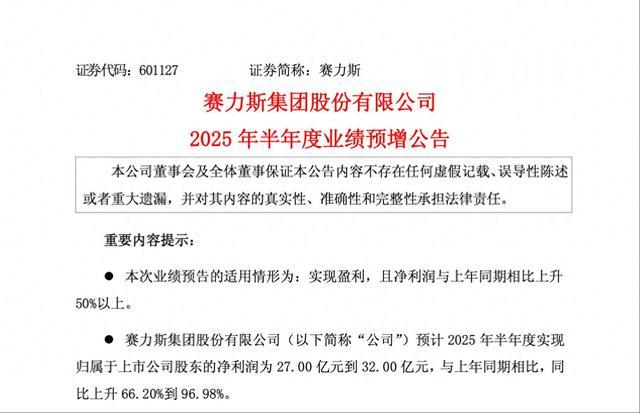 公告显示,赛力斯集团股份有限公司预计2025年半年度实现归属于上市公司股东的净利润为27亿元到32亿元,与上年同期相比,同比上升66.20%到96.98%。