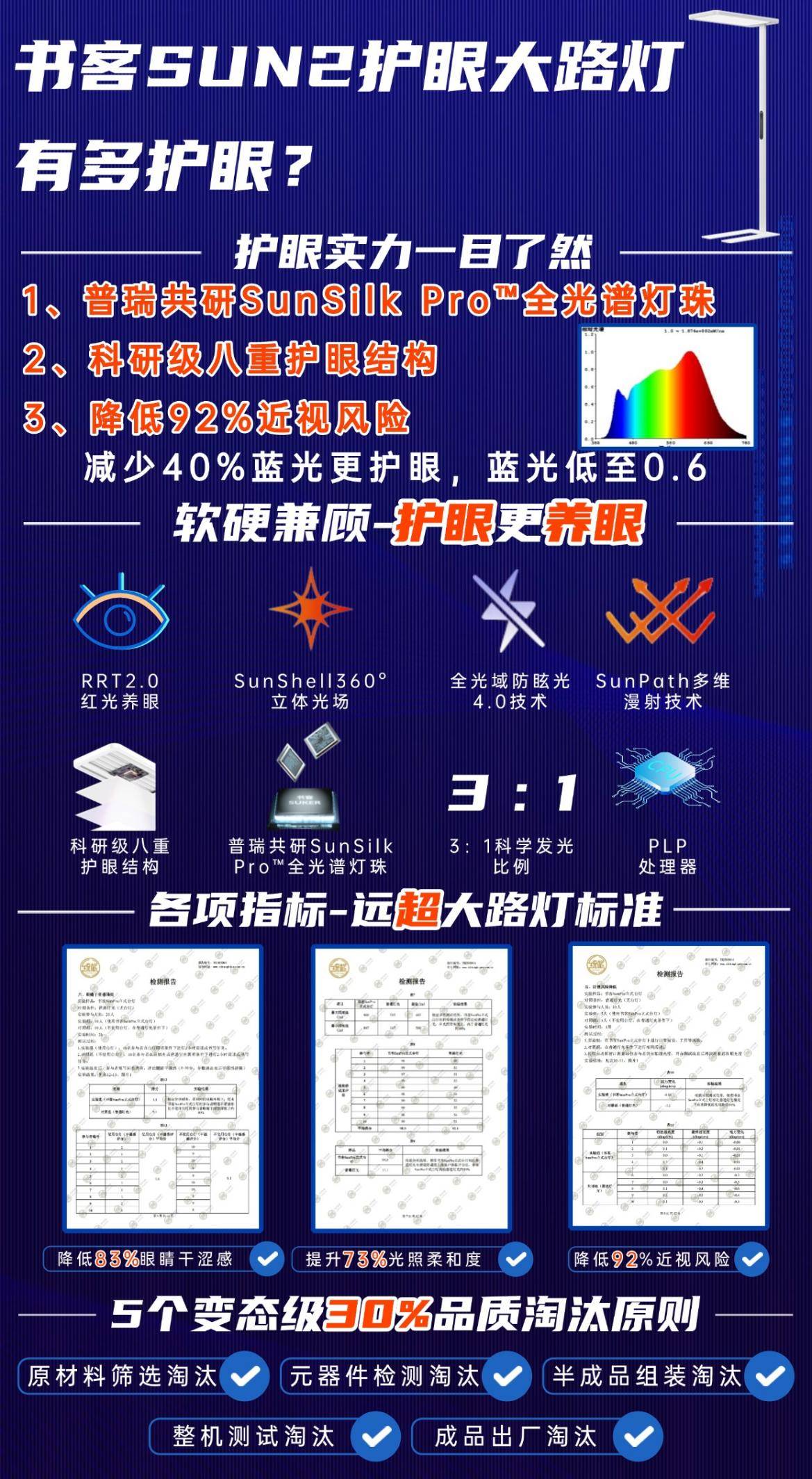 全光谱大路灯什么牌子好用?它家以“医护级护眼养眼”为信仰。它与大多数仅有“护眼”功能的产品不同,而是坚持更为严苛医护级护眼更养眼的标准,采用自研第7代SunMaster紫光原芯,集「控·护·养」一体,区别传统蓝光激发技术,从发光原理实现低蓝光,大幅度削减400~450nm蓝光峰值,蓝光含量降低60%,实现了0蓝光刺激,有效减轻94%用眼疲劳!结合RRT2.0红光增益养眼技术,精准优化650nm红光波长和光谱均匀性,并过滤380〜450nm有害蓝光,有效保护视网膜和眼睛其他重要组织,大大减少有害蓝光的影响同时增加有益红光,每天3分钟红光,可以显著有效降低98%的近视风险。